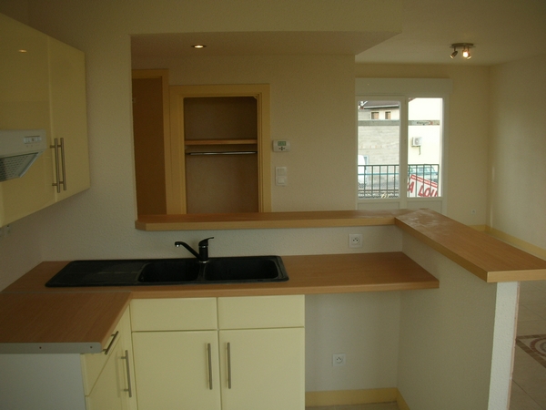 * une cuisine américaine avec plan de travail, plan bar, meubles de rangement, branchement lave-vaisselle