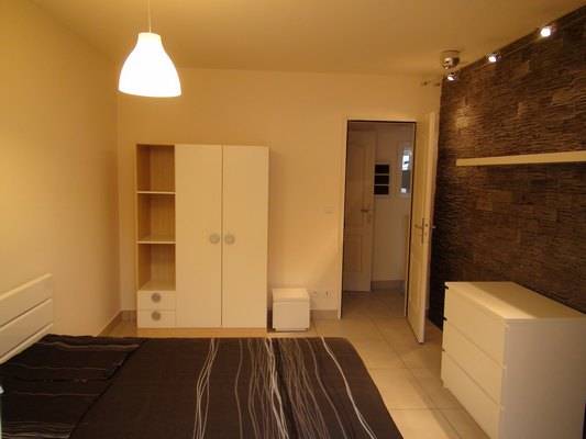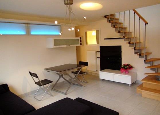 F3 composé d’un salon et de deux chambres dont une en mezzanine ; cuisine américaine équipée de meubles de rangements, électroménager, plan de travail et plan bar.