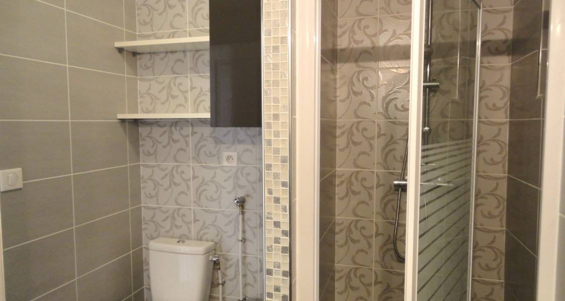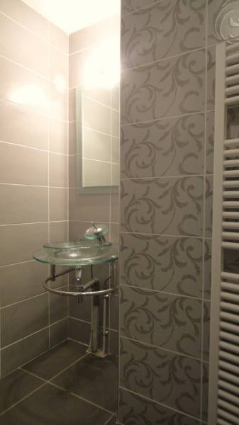 - La salle d’eau est entièrement carrelée, les murs sont décorés avec une faïence couleur grise et une frise style « baroque design »