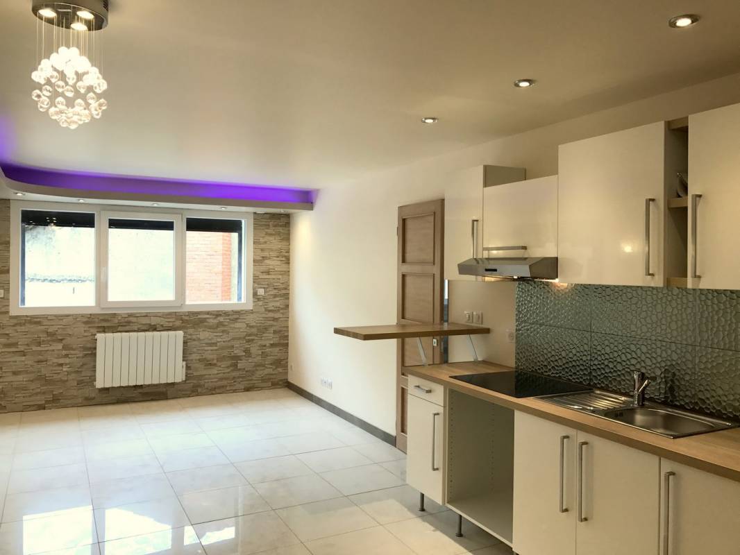 La cuisine est équipée de mobilier (meubles hauts et meubles bas), d’un évier, d’une plaque de cuisson vitrocéramique, d’une hotte, d’un plan bar. Un emplacement est prévu pour l’insertion d’un four. Un réfrigérateur avec partie congélation est aussi mis à disposition dans le logement.