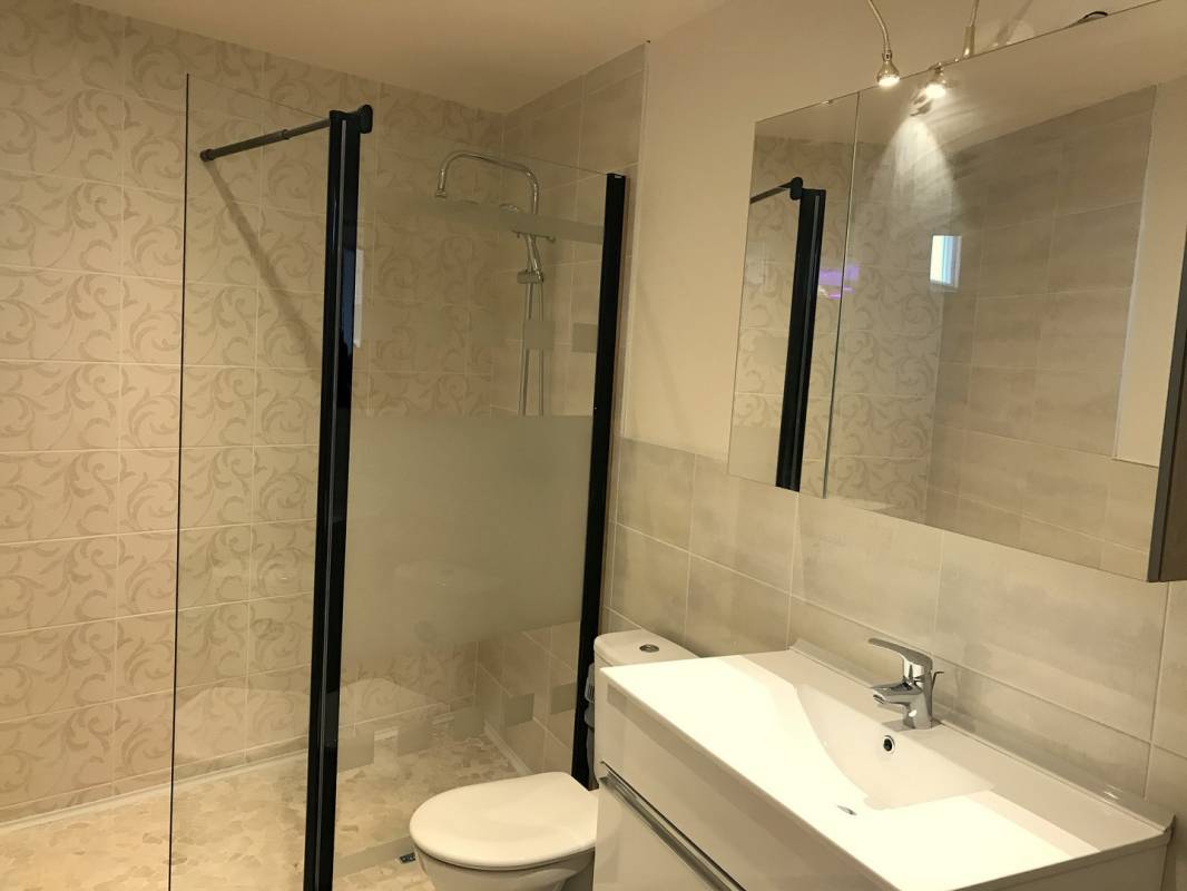 La salle de bain est équipée d’une douche italienne avec porte vitrée, d’un meuble lavabo avec armoire de toilette, d’un WC, d’un radiateur sèche serviette et d’une étagère de rangement.