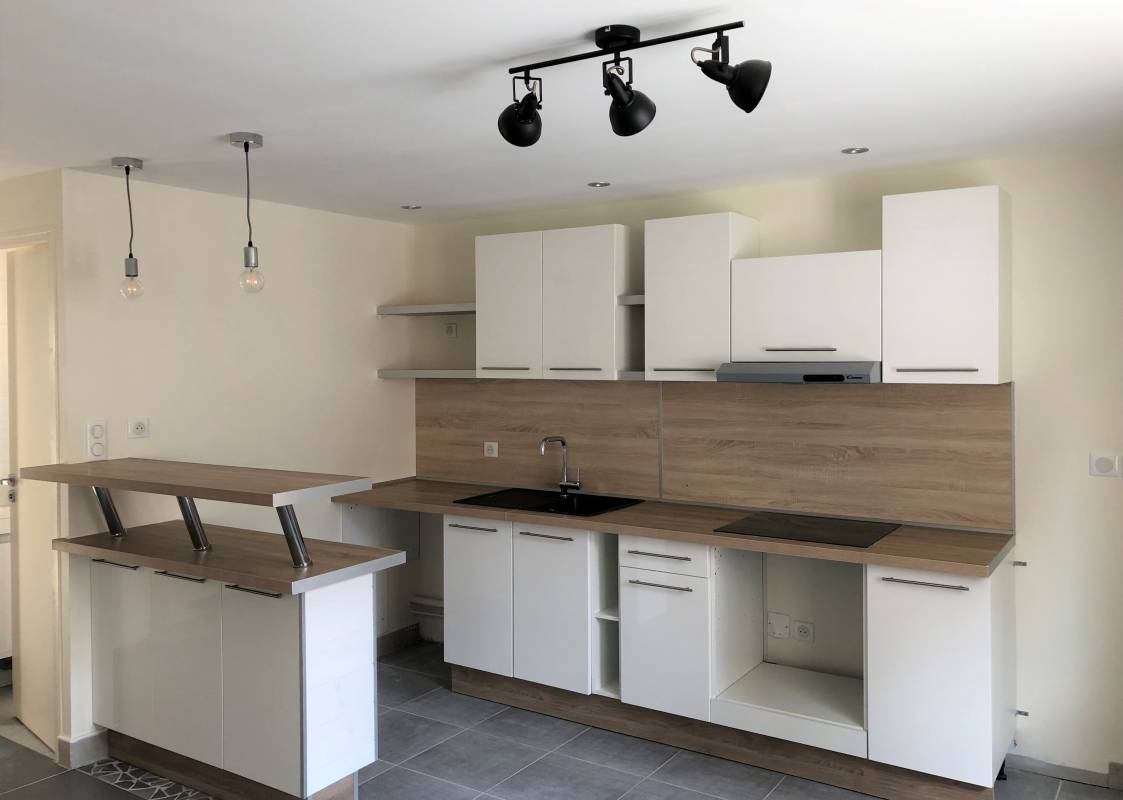 La cuisine est équipée de meubles de rangement, de plaques de cuisson vitrocéramiques et d’une hotte. Également, un plan Bar est installé et sépare le coin cuisine de la pièce de vie.