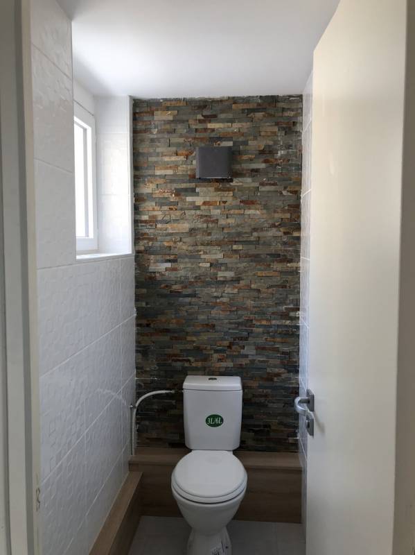 La salle d’eau est composée d’une douche avec porte vitrée, d’un lavabo double vasques avec meuble de rangement, d’un WC, et elle est équipée d’un radiateur sèche serviette. Les sols sont entièrement carrelés et les murs recouverts de faïence.