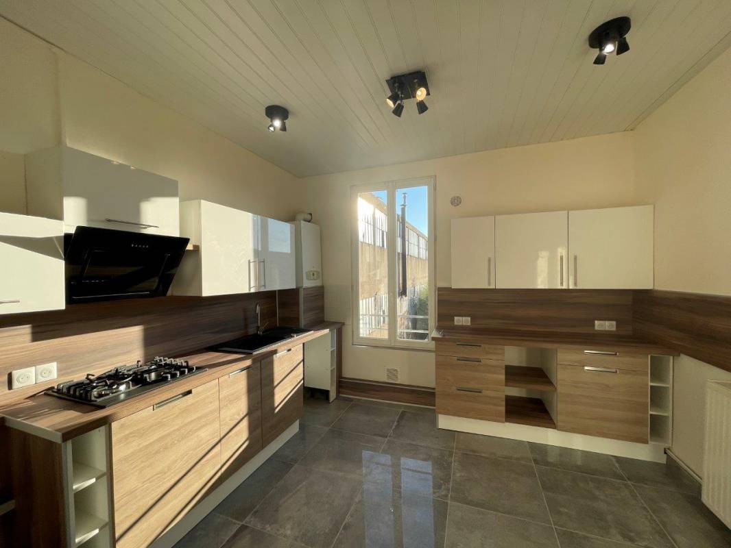 La cuisine est équipée de mobilier (meubles hauts et meubles bas), d’un évier, d’une plaque de cuisson gaz et d’une hotte.