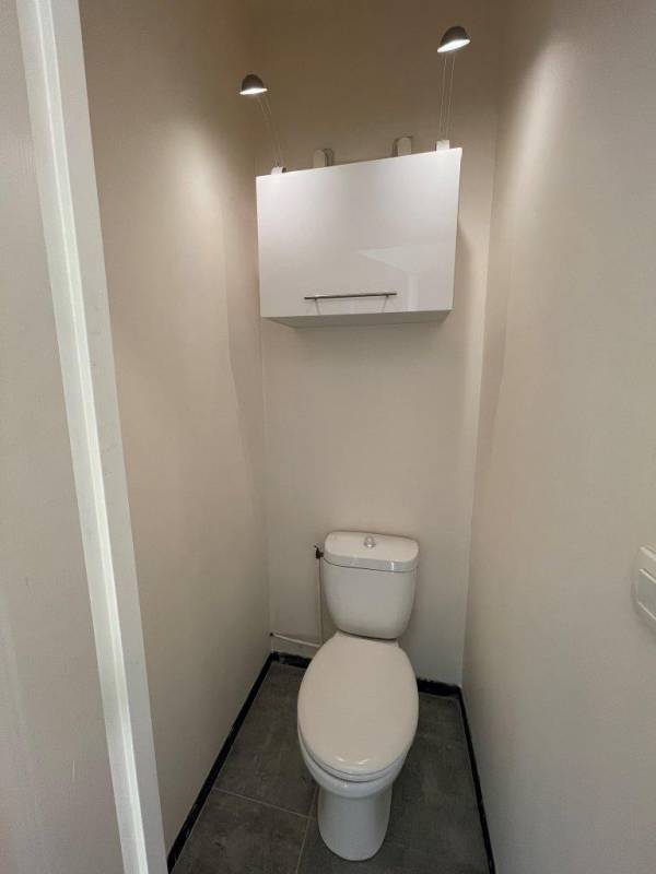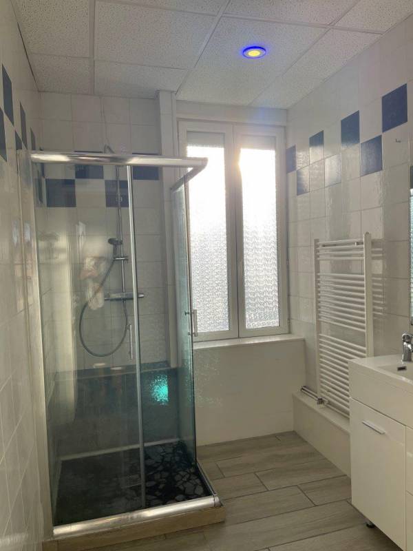 La salle d’eau est équipée d’une cabine de douche avec porte vitrée, d’un meuble lavabo avec armoire de toilette ; d’un espace pour la mise en place de la machine à laver et d’un WC indépendant.